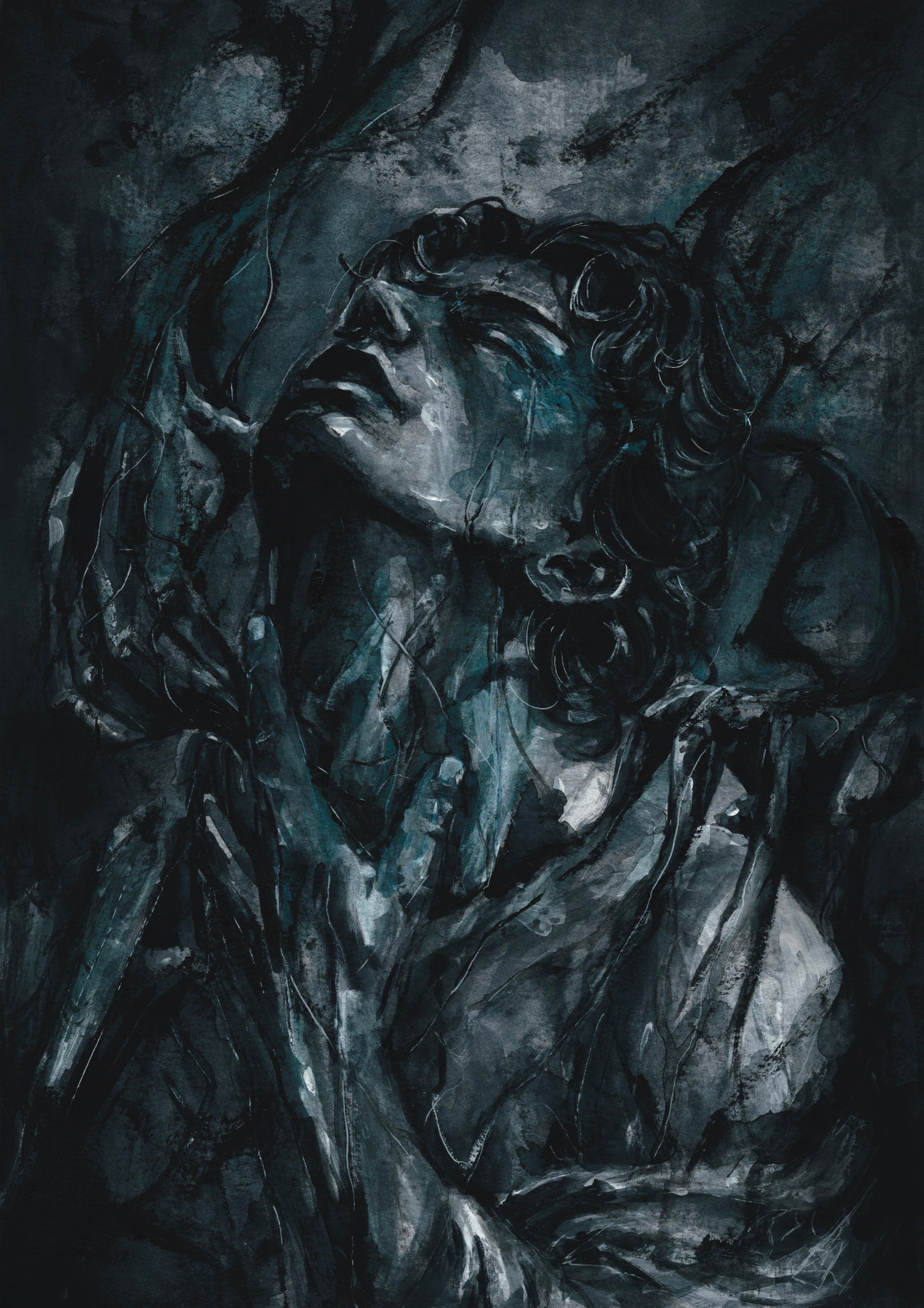 Ses larmes tracent le sillage de son impuissance, son visage levé vers sa propre conscience qui ne répond pas. Sa lutte est un cri silencieux contre l’emprise du démon en lui qui en fait un bourreau malgré lui. Il est un fils, un prince, une âme enchaînée.