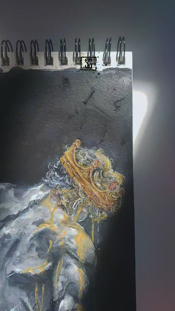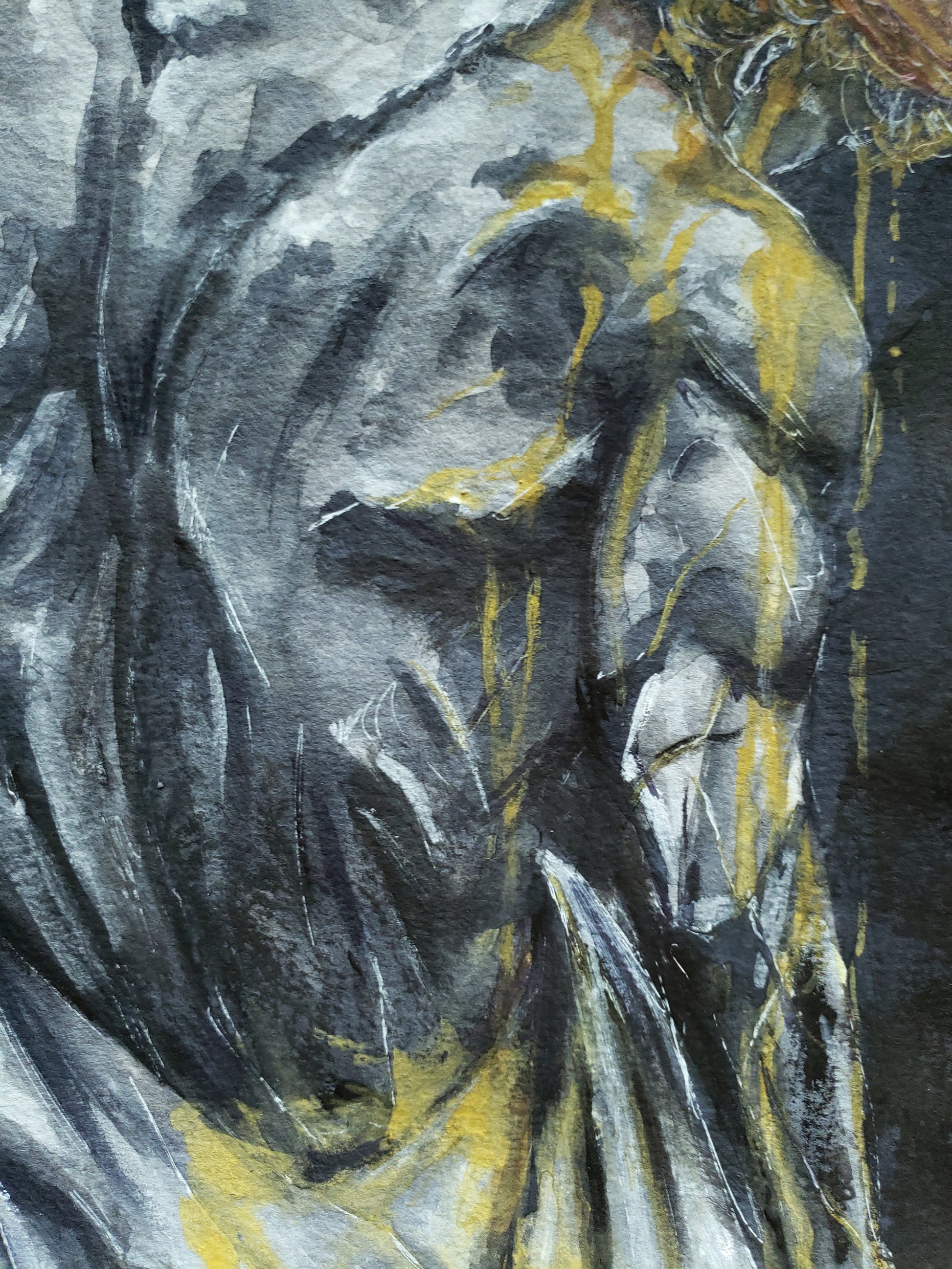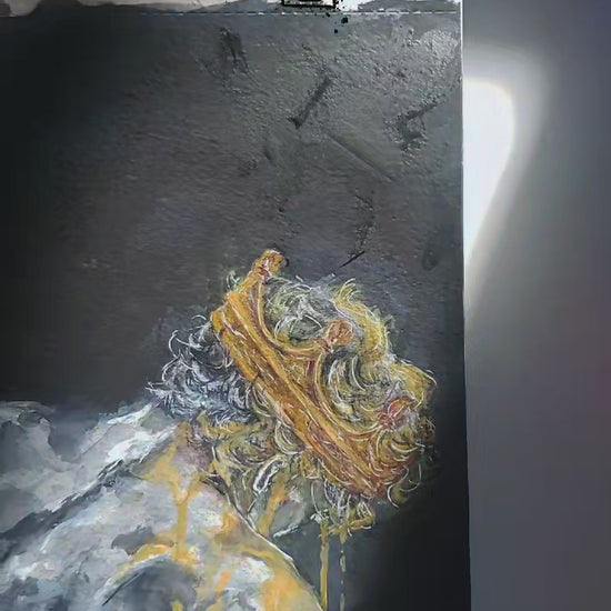 Ce jeune roi est peint couronné, mais sans gloire : la couronne coule d’or en fusion, ruisselant sur son visage et son corps comme du sang. Elle s’accroche à lui, comme si les dieux eux-mêmes l’avaient marqué de leur toucher cruel, pour qu’on se souvienne qu’il est devenu ce qu’il craignait le plus. Il est les péchés de son père.