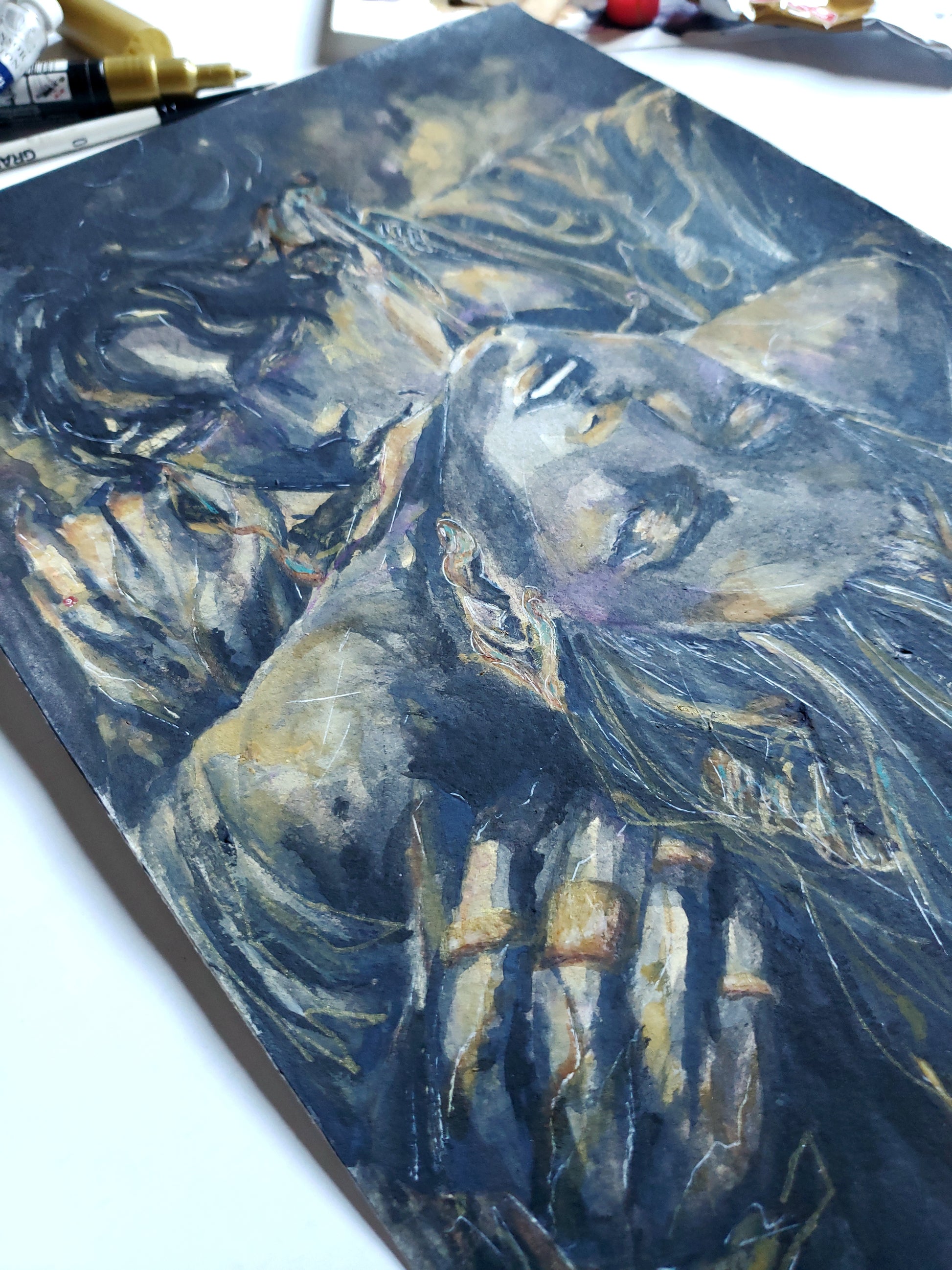 Sur le papier, noir et or se mêlent comme l’univers des fae, cruel et incandescent. Ses doigts à lui frôlent presque son oreille, comme une confession muette, tandis que ses lèvres effleurent un aveu qu’elle pensait ne jamais entendre. Car entre eux se tiennent les lettres volées, les confessions de son roi. Et dans les noirs et ocres de la peinture, dans cette lumière vacillante, on devine ce qui fut tû, ce qui fut caché : l’amour d’un roi qui comme elle, a portée une armure trop longtemps.