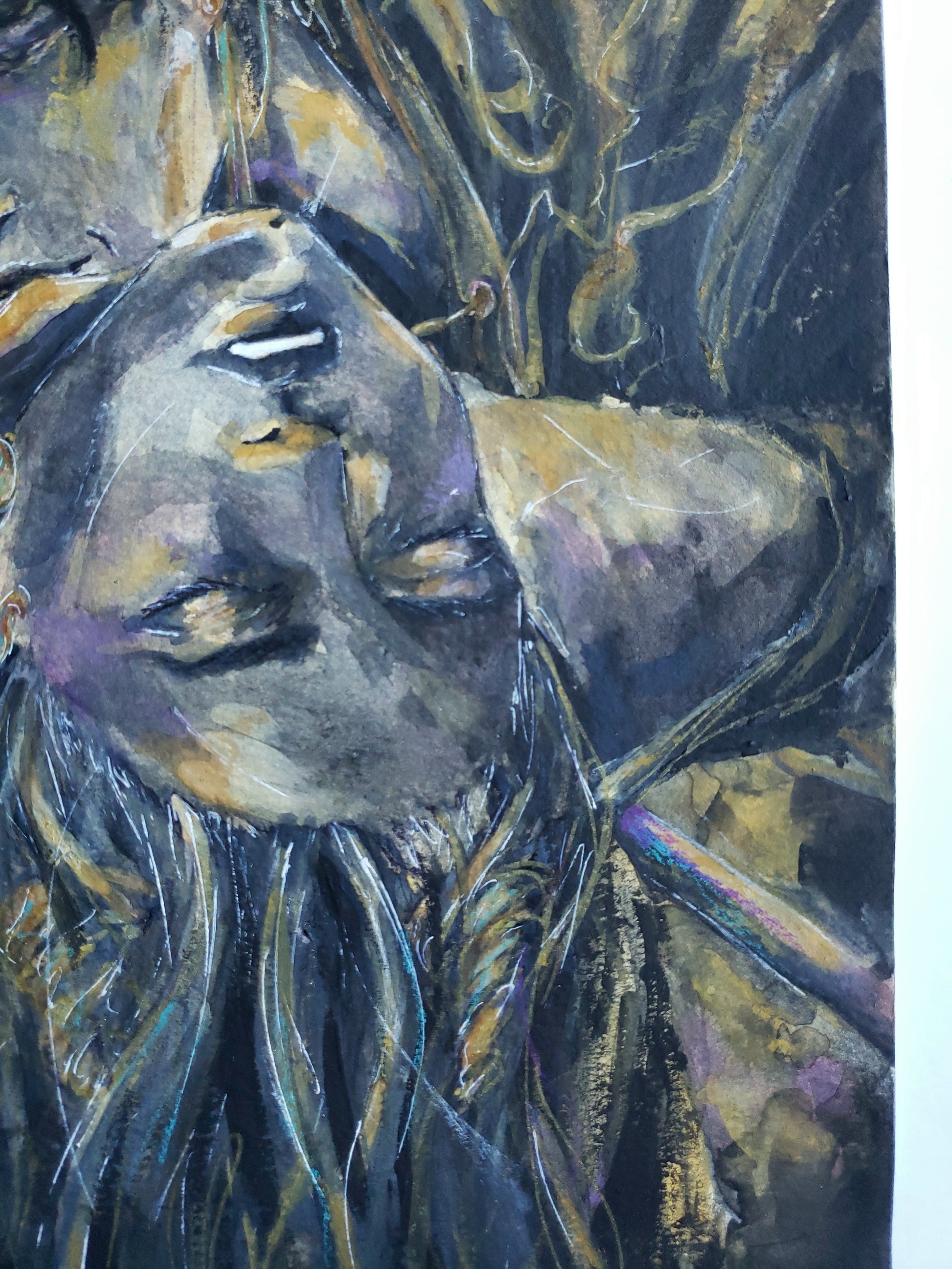 Peinture sur papier aquarelle 300gr (140 lb) en format A4, 21 x 29.7 cm ou environ 8 x 10 inches. Elle est réalisée avec un mélange d'aquarelle, acrylique, crayon de couleur et de POSCA doré.